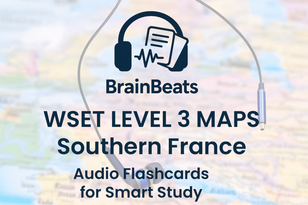 This audio-first pack was created to complement the WSET L3 workbook’s map of Southern France. It targets place names, appellations, and geographic logic, reinforcing your memory with clear, active recall prompts.