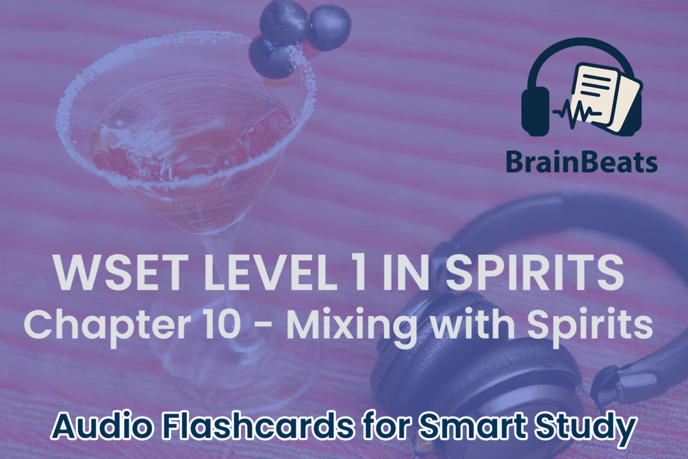 Youβll get 50 flashcards focused on the principles of cocktail creation and the classic cocktail families. This pack teaches you how to balance key components like strong, weak, sour, sweet, and bitter, and helps you understand what makes drinks like the Old Fashioned, Pisco Sour, and Mojito work. Each flashcard includes a question and timed pause followed by the answer, so you can test your recall and reinforce your knowledge while listening. Perfect for WSET Spirits Level 1 students, bartending trainees, and cocktail enthusiasts who want to internalize mixology fundamentals with zero screen time.